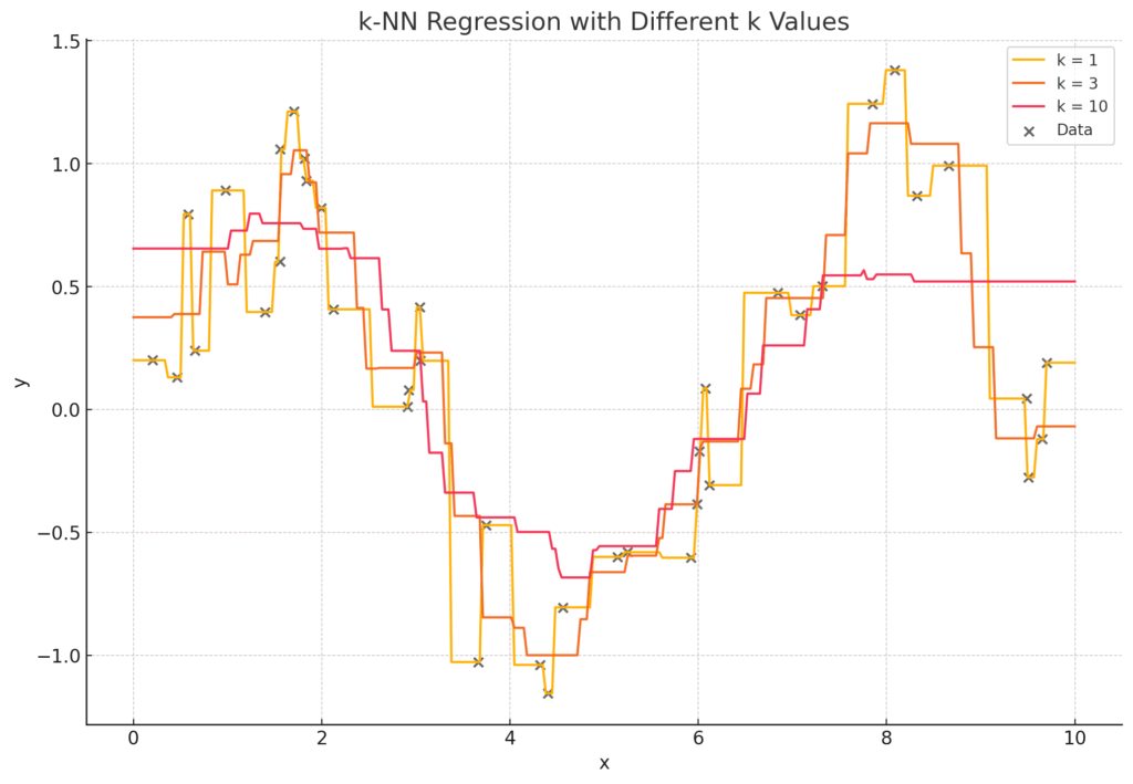 しかし、一度立ち止まって考えてみると、k近傍法の場合、なぜk=3なのか、という疑問が浮かんでくる。そしてK=データ数(N)と設定してやればデータと完全一致するモデルを構築することができるということになる。これは従来型の回帰分析などのカーブフィッティングで多項式の次数をデータNに対してN-1と設定する(およびパラメータを調整する)ような話で、そのようなことをすれば、当然データと完全一致するモデルを構築することができる。しかしこれは当然ながらオーバーフィッティング(過学習)であり、手元に存在するデータを丸暗記したにすぎず、新しいデータを予測することはできない。このような際に従来型のパラメトリックなカーブフィッティングではAICなどを用いたが、ノンパラメトリックな手法の場合、交差検証(Cross Validation)を用いる。交差検証はデータをトレーニングセットとテストセットに分割して、トレーニングセットで学習したモデルがテストセットを予測することができるかという形でモデルを検証する。ちなみにTake-One-Out-Cross-Validationと呼ばれる交差検証は特定条件下でAICと等値となる。それによりこのkの数を調節する。このkのようなものはハイパーパラメータと呼ばれ、カーネル密度推定、局所回帰(LOESS)、平滑化スプラインなども基本的には同じような考え方であり、交差検証によりハイパーパラメータを調整してモデルを生成する。