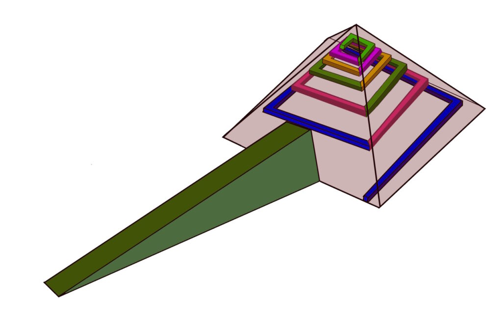 一つ目の仮説、内部回廊説に対するモチベーションは単純で、古代エジプト人はどのようにして大きな石をピラミッドの上まで持って上がったのかということに関して、従来型の説では砂などで傾斜路を作り持って上がるというものであるが、大きな石を運べる限界傾斜を考えるならば、傾斜路は相当大きなものでなくてはならず、ピラミッド頂上部まで石を運ぶ際には、傾斜路自体がピラミッドくらいの大きさになってしまい、あまりにも非効率ではないか、ということに端を発している(下記図)。ではもっと効率的に外部に砂などで回廊を作ったら良いのではないかといえば、それでは外部からピラミッド自体が見えなくなってしまい、建築段階でピラミッドの整形がしづらく、シンメトリーが崩れてしまう恐れがある。ゆえに内部回廊があった(ある)のではないかという仮説が出てくることになる。