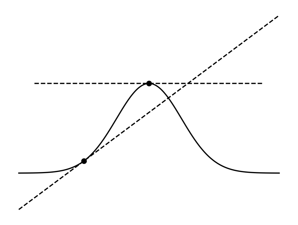 因みにこのような正解か間違いか、表か裏か、といったような分布は二項分布と呼ばれるが、「コインは公正である(表=裏=½)」とか「ミュリエル・ブリストルは違いがわからない(彼女の選択はランダムである)(正解=間違い=½)」などと仮説を設定した時の尤度P(O|H)を最大化させることは最大値(もしくは最小値)を探すことに等しい。このような単純な場合は図をみれば一目瞭然なのだが、理論的には分布図に接する線の傾きを0にする作業である(下記図)。曲線に対する接線は曲線の微分を取れば良いので、微分=0になるポイントを探すことになる。これがフィッシャーの考えた(点)推定であり、それは尤度P(O|H)を最大化させる最大尤度(一点)を求めることに等しい(このような単純な場合には、微分が使えるが、曲線が複雑な場合には局所的な最大値に捕まってしまうことがあるため、勾配法などといった方法を用いる。これは微分の逆操作である積分が難しい時にモンテカルロ手法などを用いることと似ている)。
